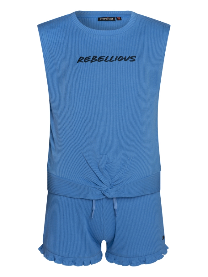 Deze mooie 2-delige set bestaande uit een mouwloos shirt met broekje draagt de tekst Rebellious op het shirt. Het shirt heeft tevens een draaisel in de stof onderin. De set zat? Trek hem dan uitelkaar en mix en match met de items die je al hebt!