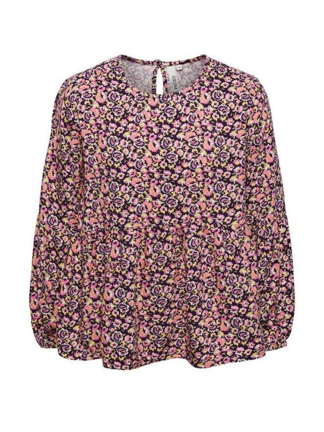 Blouse van Little Pieces. Deze blouse heeft een bloementjes print in de kleuren: roze, paars, wit, geel en groen. Vanaf het middel is een roedel randje. Ook de onderkant van de mouwen hebben een pof en worden onder gesloten met een elastiek.