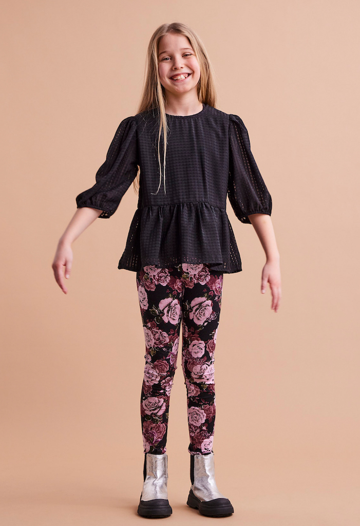 Top van Little Pieces. De top heeft pofmouwen en een uitlopende onderkant. De bovenlaag is van geruite mesh stof. Valt ruim, dit hoort zo. Materiaal: 100% polyester waarvan 60% recycled. Wassen op 30 graden, niet bleken, niet in de droger, niet strijken.