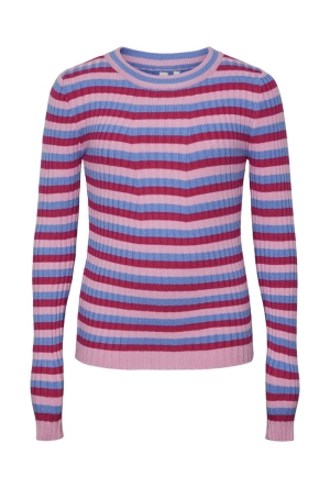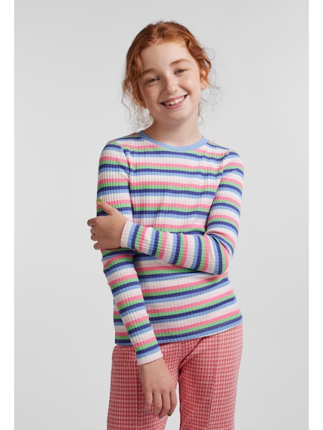 Gebreide rib top van Little Pieces. Deze top heeft een aansluitende pasvorm met lekker veel stretch, een ronde neklijn en lange aangesloten mouwen. Op de top zit een streep motief in de breedte in verschillende kleuren.