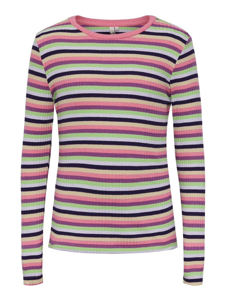 Gebreide rib top van Little Pieces. Deze top heeft een aansluitende pasvorm met lekker veel stretch, een ronde neklijn en lange aangesloten mouwen. Op de top zit een streep motief in de breedte in verschillende kleuren.