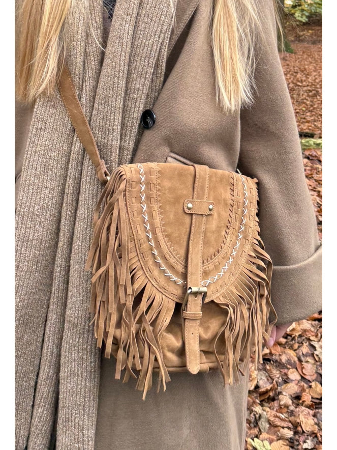 Boho suede tas met franjes. Deze leuke tas heeft een verstelbare schouderband, wordt gesloten met een magneet i.p.v. de zichtbare gesp en aan de binnenkant zit een rits. Aan de binnenkant zitten twee vakken waarvan een met rits. Afmeting: 26 x 27 cm.