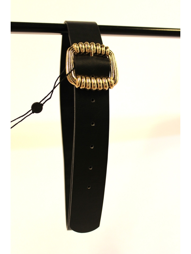 Zwarte riem met geribbelde gesp in goud of zilver. Deze riem is 3,8 cm breed.