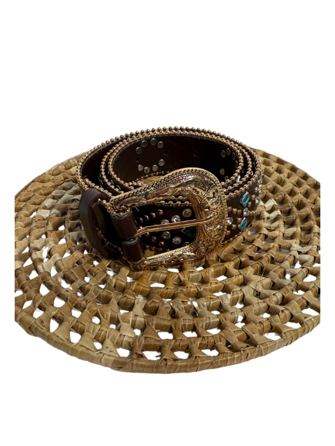 Bohemian riem met studs en aqua steentjes. De riem is van imitatie leer en heeft goudkleurig gespwerk. Draag hem op je jeans of om je boho dress!
