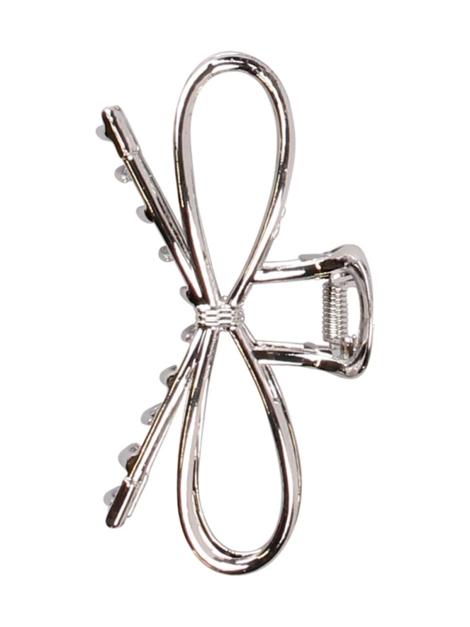 Verfijnde degelijke licht metalen haarclip in de vorm van een strik. De lengte van deze speld is 10 cm.