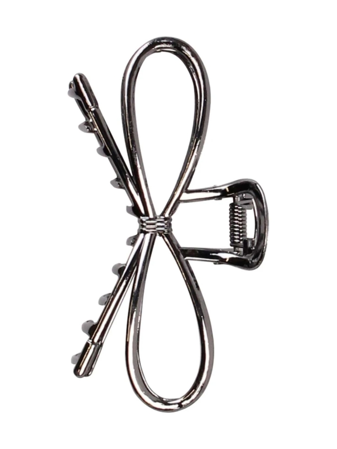 Verfijnde degelijke licht metalen haarclip in de vorm van een strik. De lengte van deze speld is 10 cm.