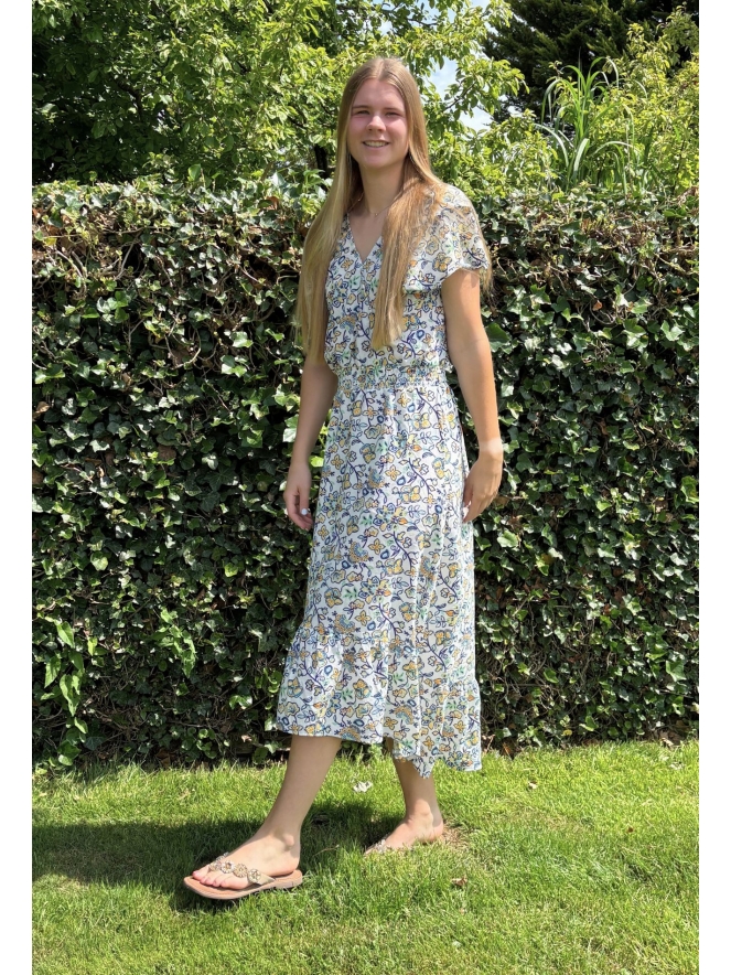 Dit toppertje laat jou stralen in de zomerzon! Deze jurk met een lengte variërend per persoon van kuit tot enkel heeft een elastieken smockband in de taille en een mooie V hals aan de voorkant. Draag hem naar het strand, op een feestje of als je op vakantie gaat!