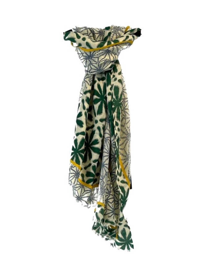 Deze sjaal met batik print heeft een afmeting van 90 x 180 cm.