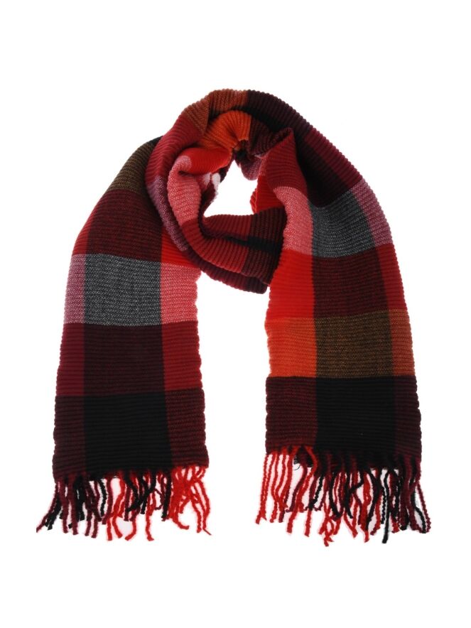 Sjaal met blokpatroon, gemaakt van een stof met ribstructuur en afgewerkt met speelse franjes.