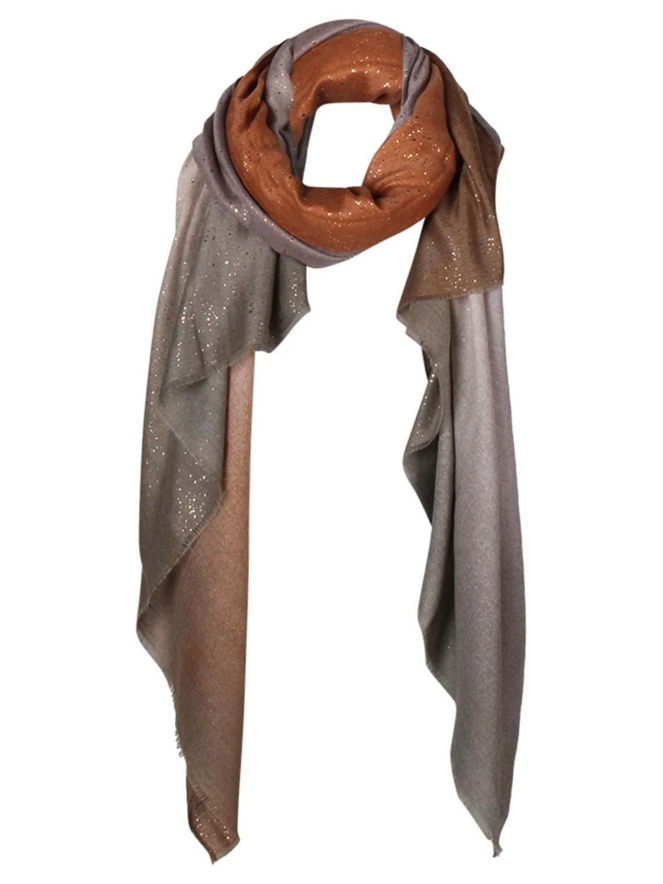 Prachtige zomerse sjaal met mooie kleurschakelingen en een goudkleurige spetterprint. Van 100% polyester.