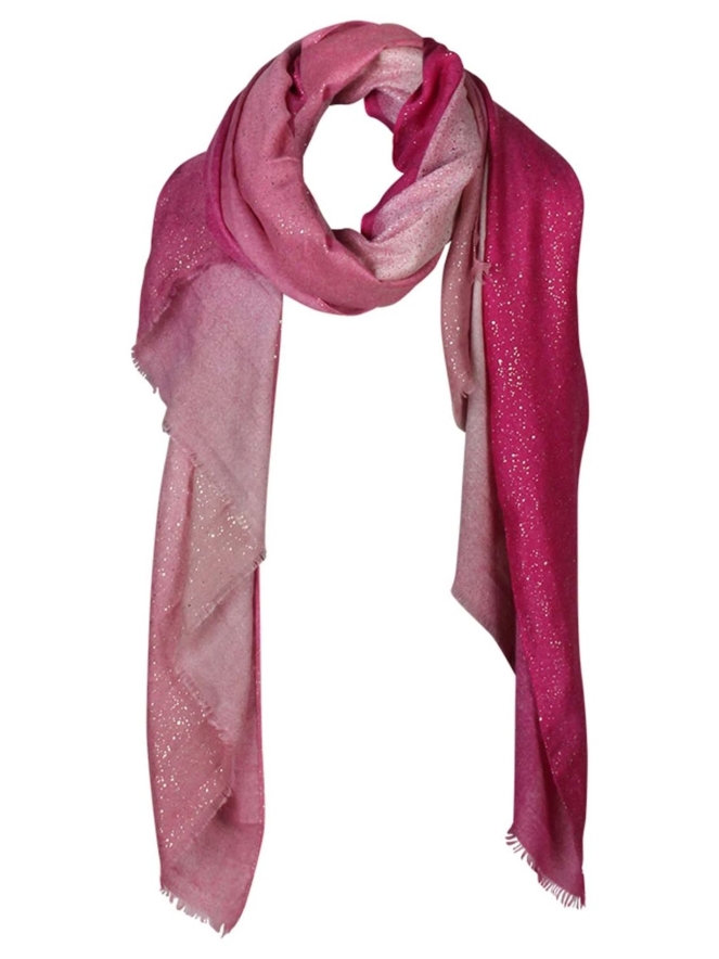 Prachtige zomerse sjaal met mooie kleurschakelingen en een goudkleurige spetterprint. Van 100% polyester.