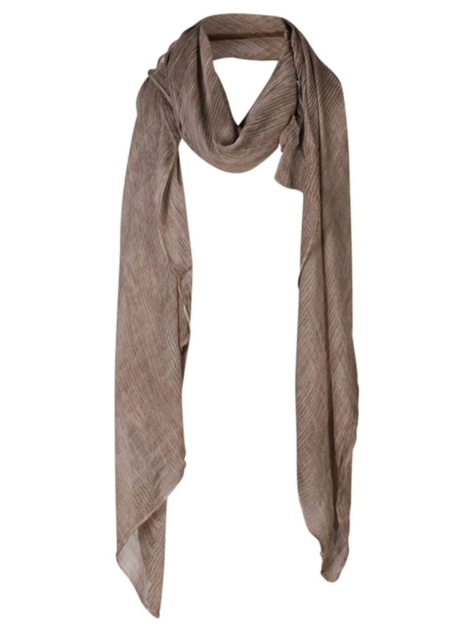 Zeer verfijnde dunne sjaal van viscose. Deze sjaal in nude kleur, offwhite of taupe heeft een afmeting van 75 x 200 cm.