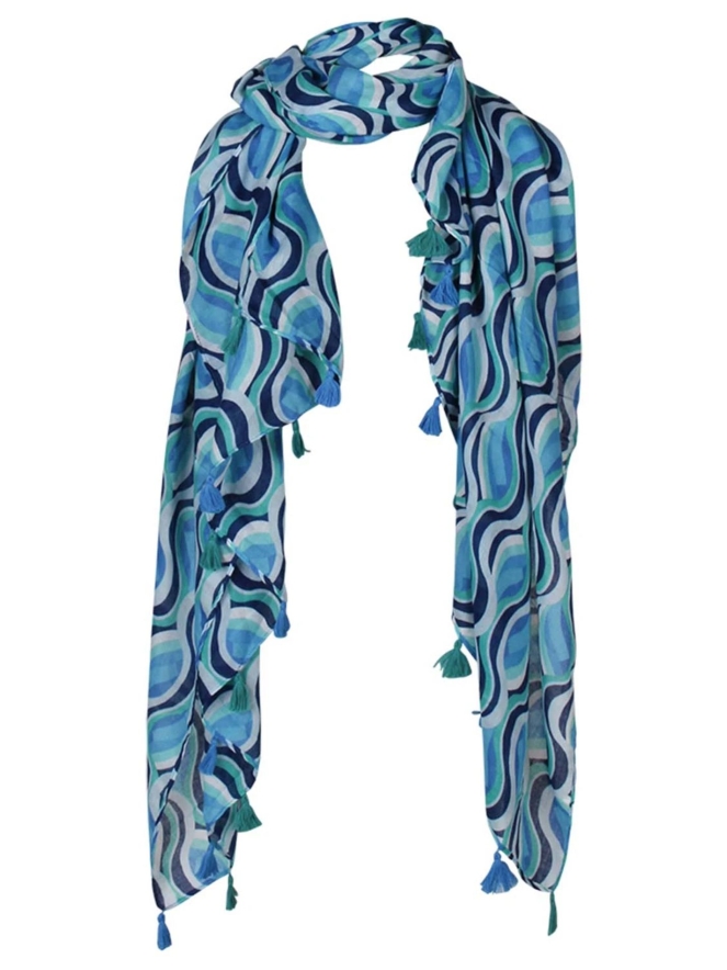 Deze mooie sjaal met opvallende retro print heeft frisse kleuren en is van polyester. De afmeting bedraagt 85 x 180 cm.