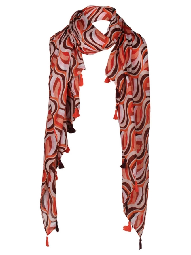 Deze mooie sjaal met opvallende retro print heeft frisse kleuren en is van polyester. De afmeting bedraagt 85 x 180 cm.