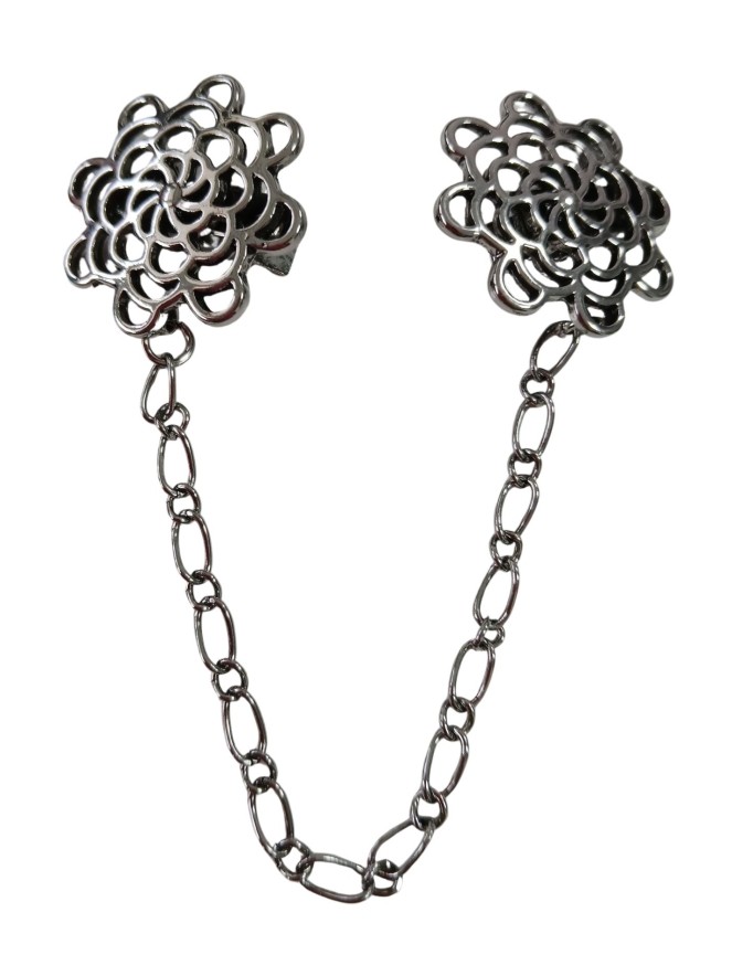 Deze broche bestaande uit 2 bloemklemmetje met een kettinkje maakt jouw vest of blouse nog sierlijker! De diameter van de bloem is 3 cm. Het is kettinkje is 12/13 cm.