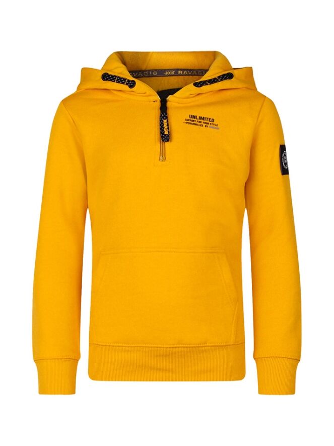 Neutrale hoodysweater met een klein ritsje en een badge op de mouw.