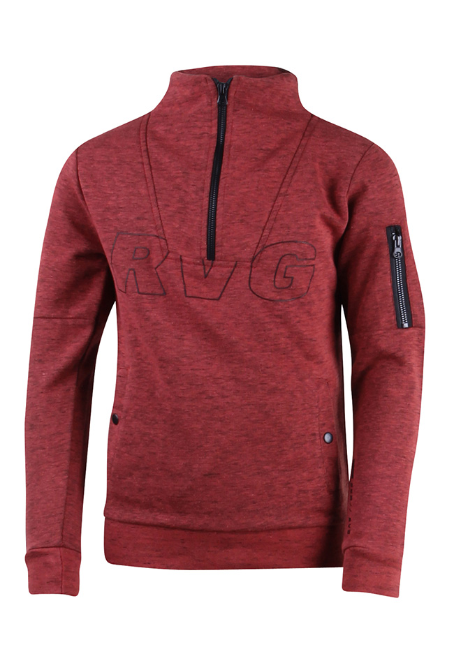 Trui van Ravagio. De trui heeft een rits bij de hals en op een van de mouwen. Er zit een zak op de voorkant. De trui heeft een hoge col. Materiaal: 65% polyester, 35% katoen. Wassen op 30 graden, niet bleken, niet in de droger, kan gestreken worden.