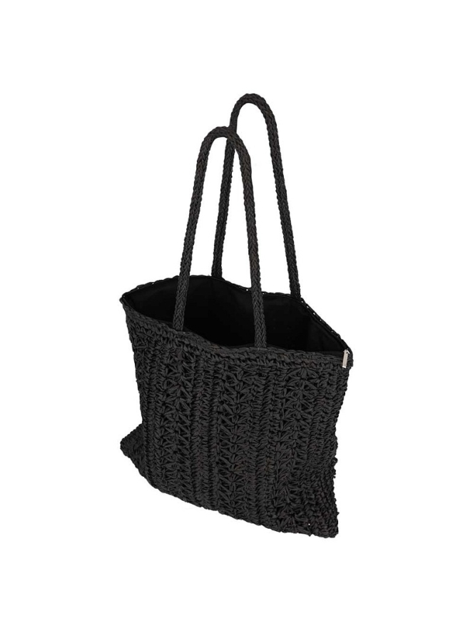 Deze zwarte gevlochten tas heeft een afmeting van 40 x 40 cm. De tas wordt aan de bovenkant gesloten met een rits.
