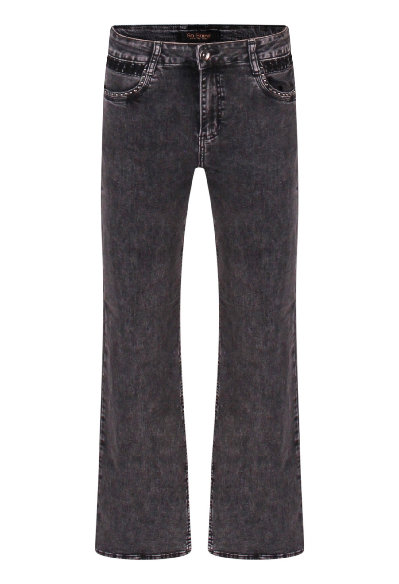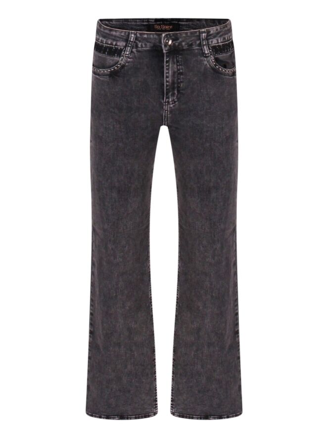 Deze straight-fit jeans is gemaakt van stretch denim voor extra comfort. Hij heeft stoere studs en subtiele borduurdetails, wat ?m een opvallende maar draagbare look geeft. Perfect te combineren met een casual top of een blouse voor een iets nettere look.