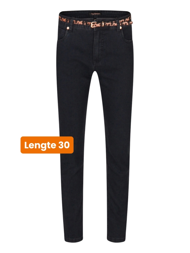 Deze damesjeans is uitgevoerd in een klassiek 5-pocketmodel en heeft een trendy panterceintuur als opvallend detail. De broek heeft een lengte van 30 inch en is gemaakt van een comfortabele denim met lichte stretch. Perfect om eindeloos te combineren, van een casual look met een basic shirt tot een meer geklede outfit met een blouse en hakken. Een stijlvolle essential voor je garderobe!