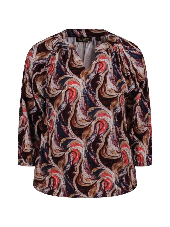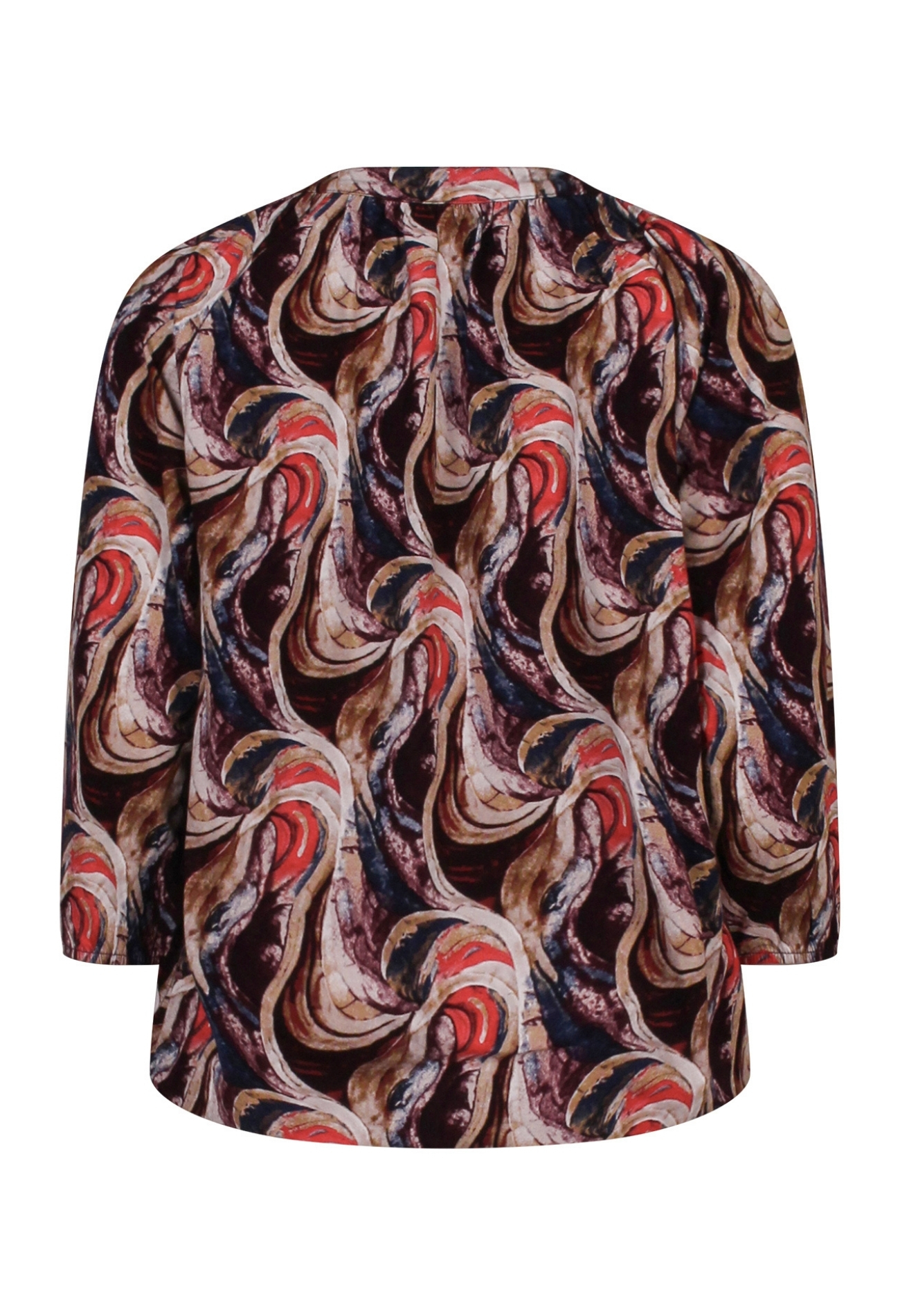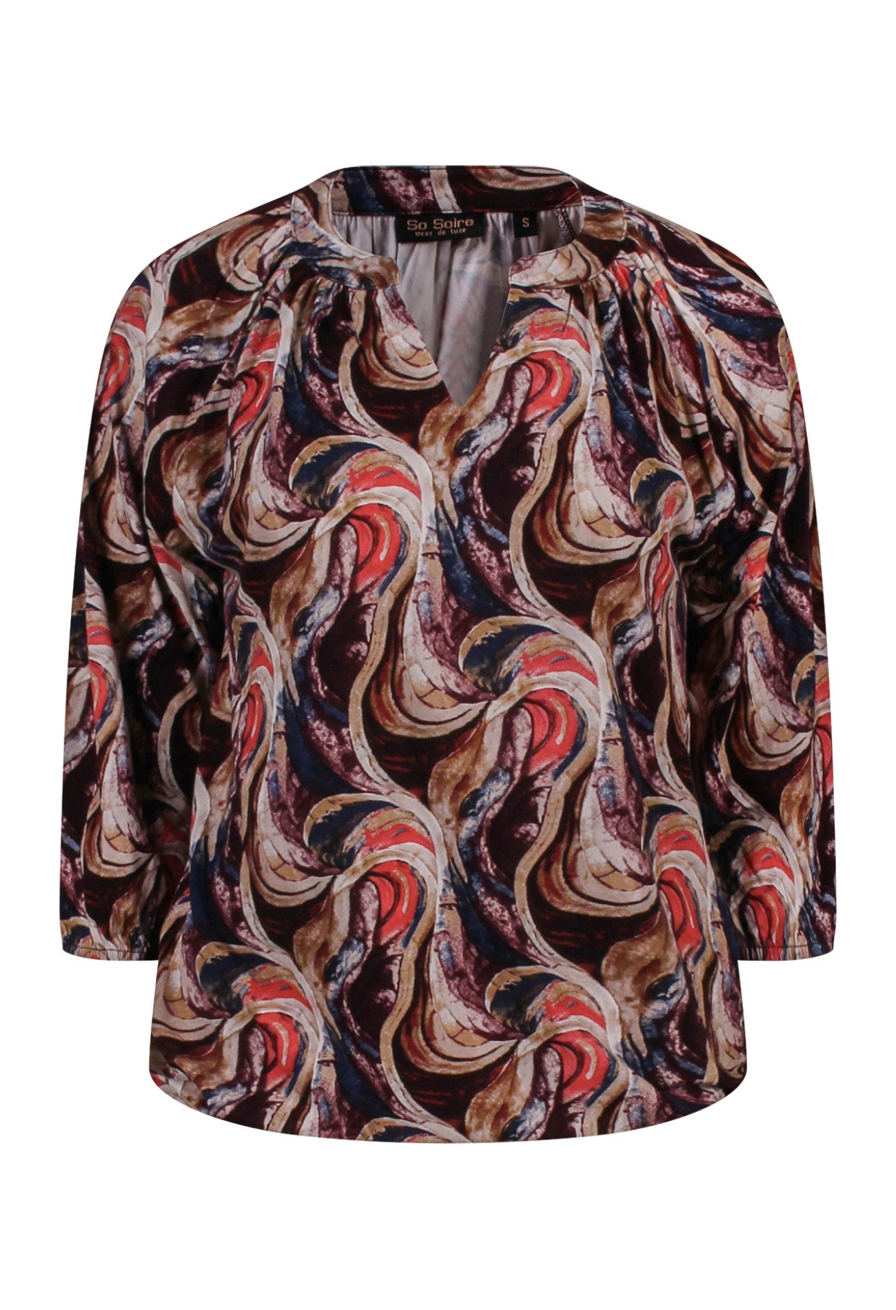 Deze dames top is gemaakt van een comfortabele viscosemix met een speels dessin. Het subtiele mao-kraagje en de 3/4 mouwen geven de top een elegante uitstraling. Dankzij het elastiek aan de onderkant en bij de mouwen krijgt de top een licht blousend effect en een mooie pasvorm. Perfect te combineren met een jeans of rok voor zowel een casual als een meer geklede look.