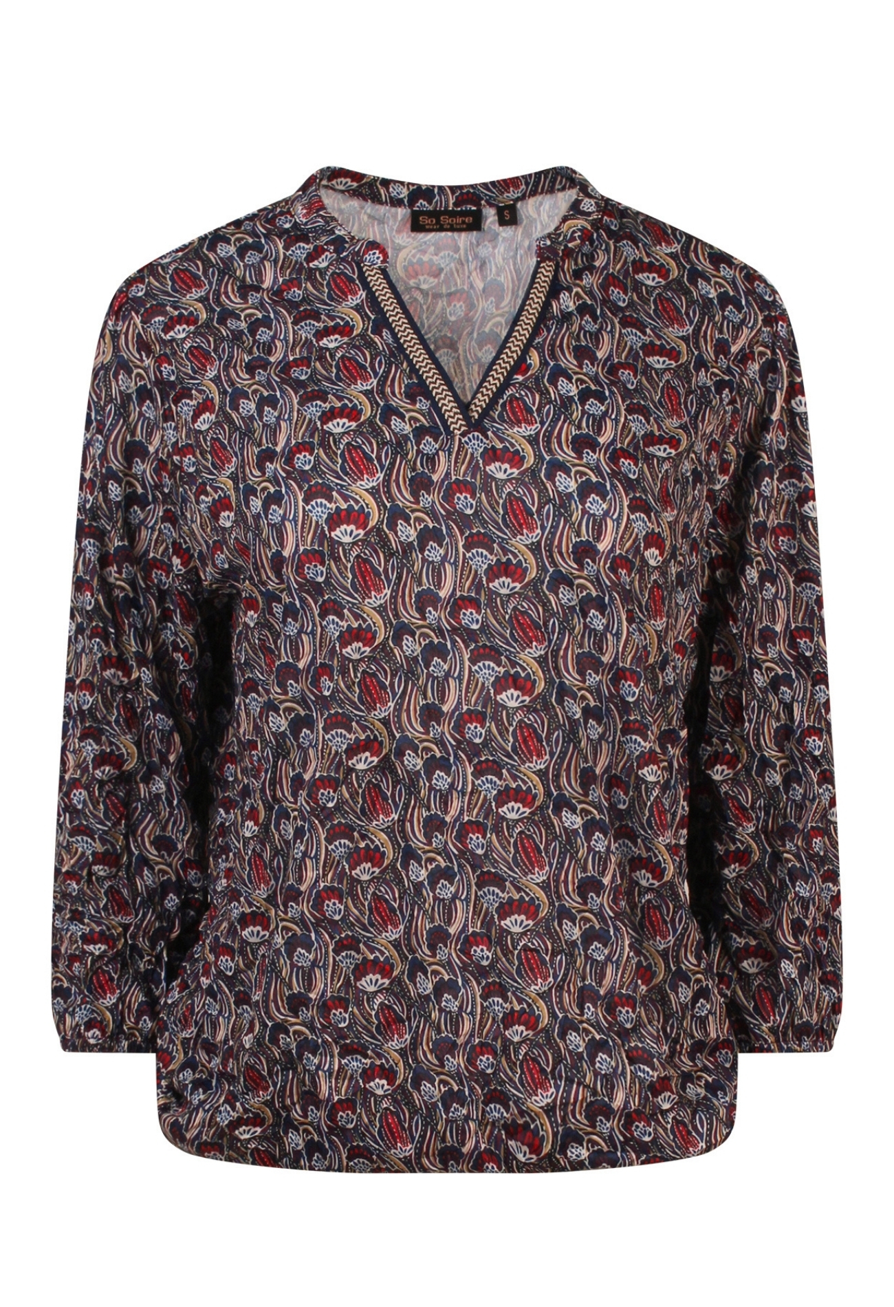 Deze dames top is gemaakt van een lichte pol crush stof en uitgevoerd met een stijlvol dessin. De fancy tape details en de 3/4 mouwen geven de blouse een moderne en elegante uitstraling. Dankzij de soepele stof draagt hij heerlijk comfortabel. Perfect om casual te combineren met een jeans of juist te stylen met een nette broek of rok voor een meer geklede look.