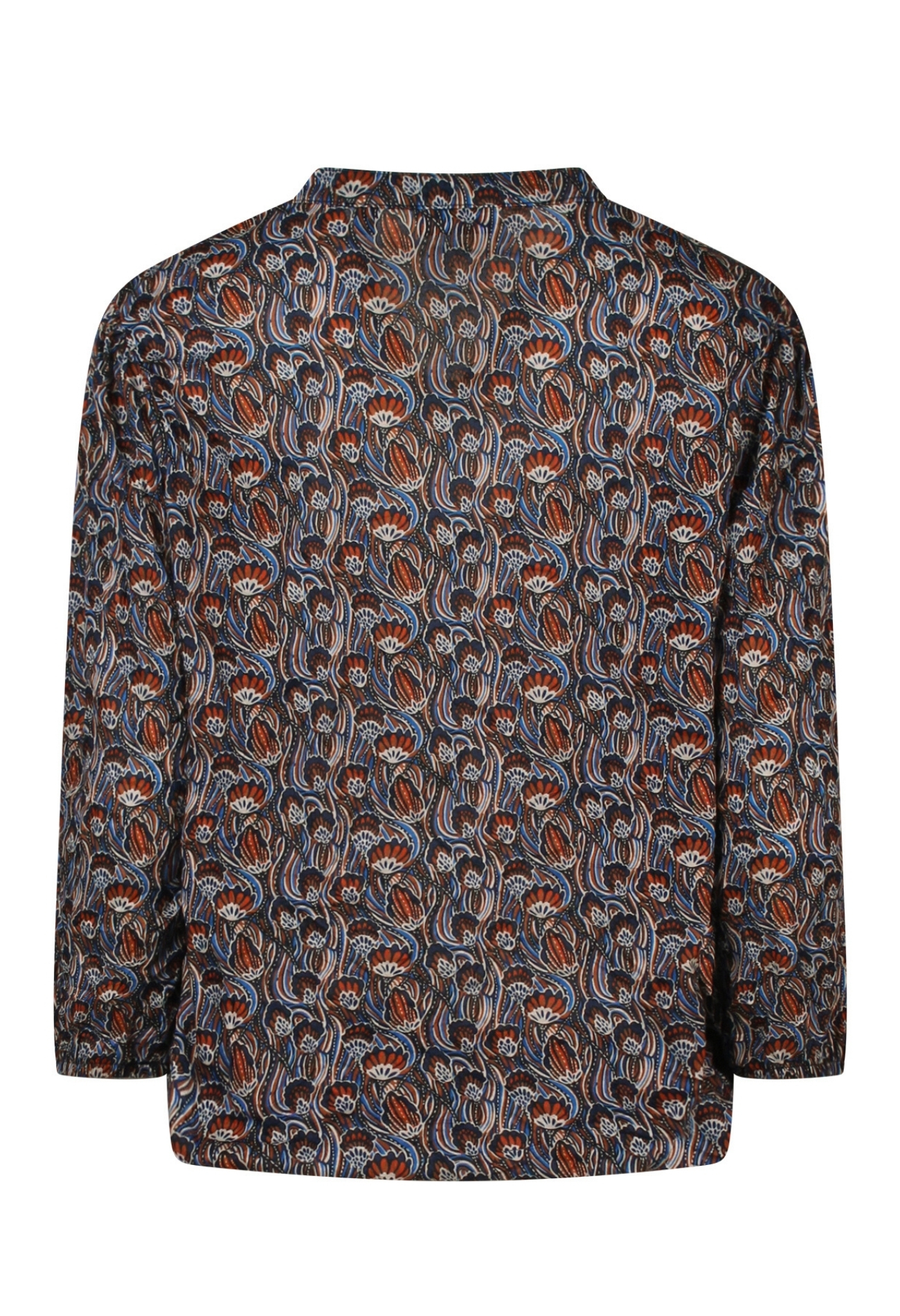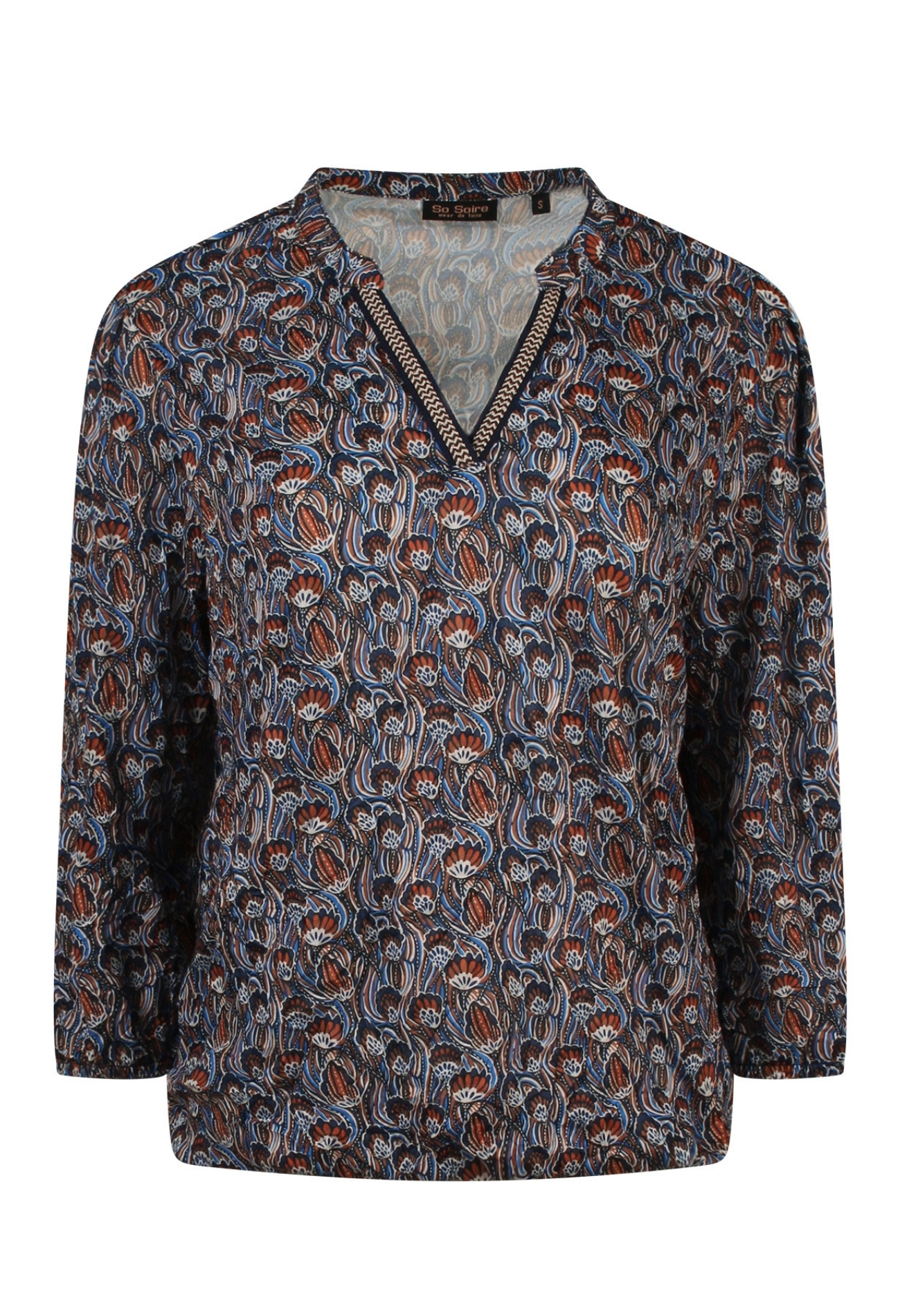 Deze dames top is gemaakt van een lichte pol crush stof en uitgevoerd met een stijlvol dessin. De fancy tape details en de 3/4 mouwen geven de blouse een moderne en elegante uitstraling. Dankzij de soepele stof draagt hij heerlijk comfortabel. Perfect om casual te combineren met een jeans of juist te stylen met een nette broek of rok voor een meer geklede look.