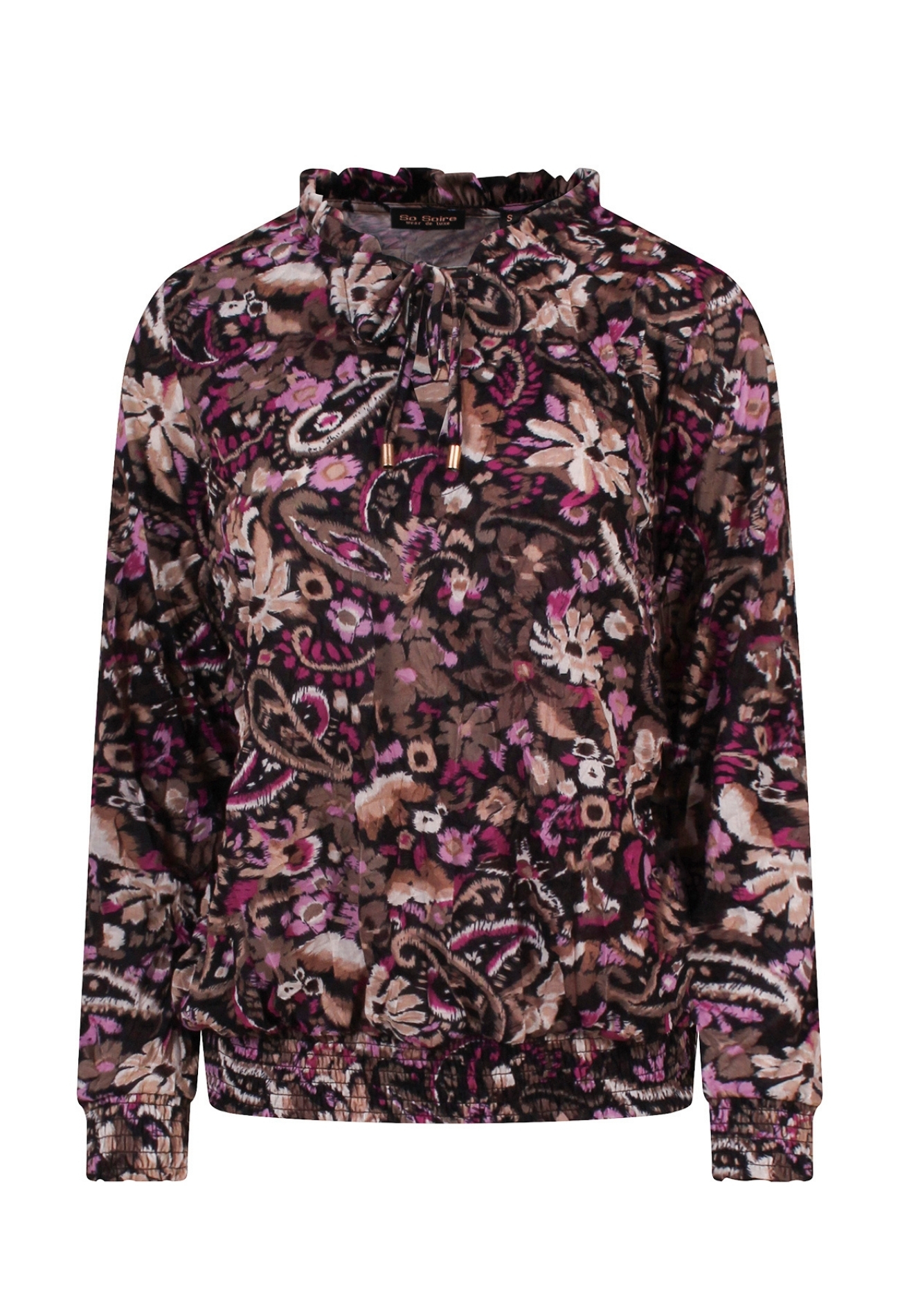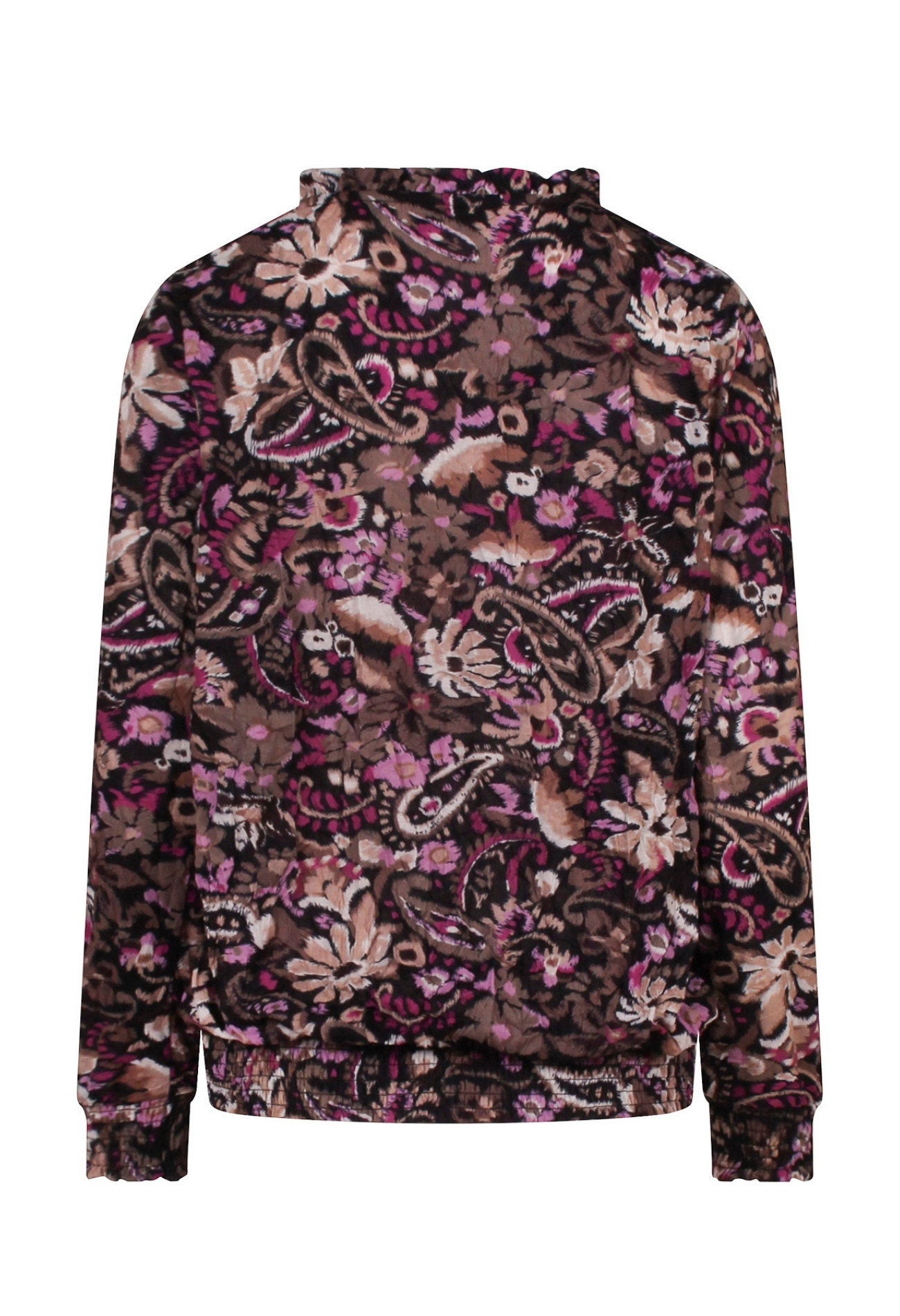 Deze dames top is gemaakt van een luchtige pol crush stof en heeft een prachtig bloem- en paisleydessin dat zorgt voor een speelse en vrouwelijke uitstraling. De ruches en gesmockte details geven de top een elegante en trendy touch. Dankzij de lichte, comfortabele stof is dit item perfect voor een zomerse dag. Combineer de top met een jeans of rok voor een stijlvolle look, of draag hem met de bijpassende broek voor een complete set.