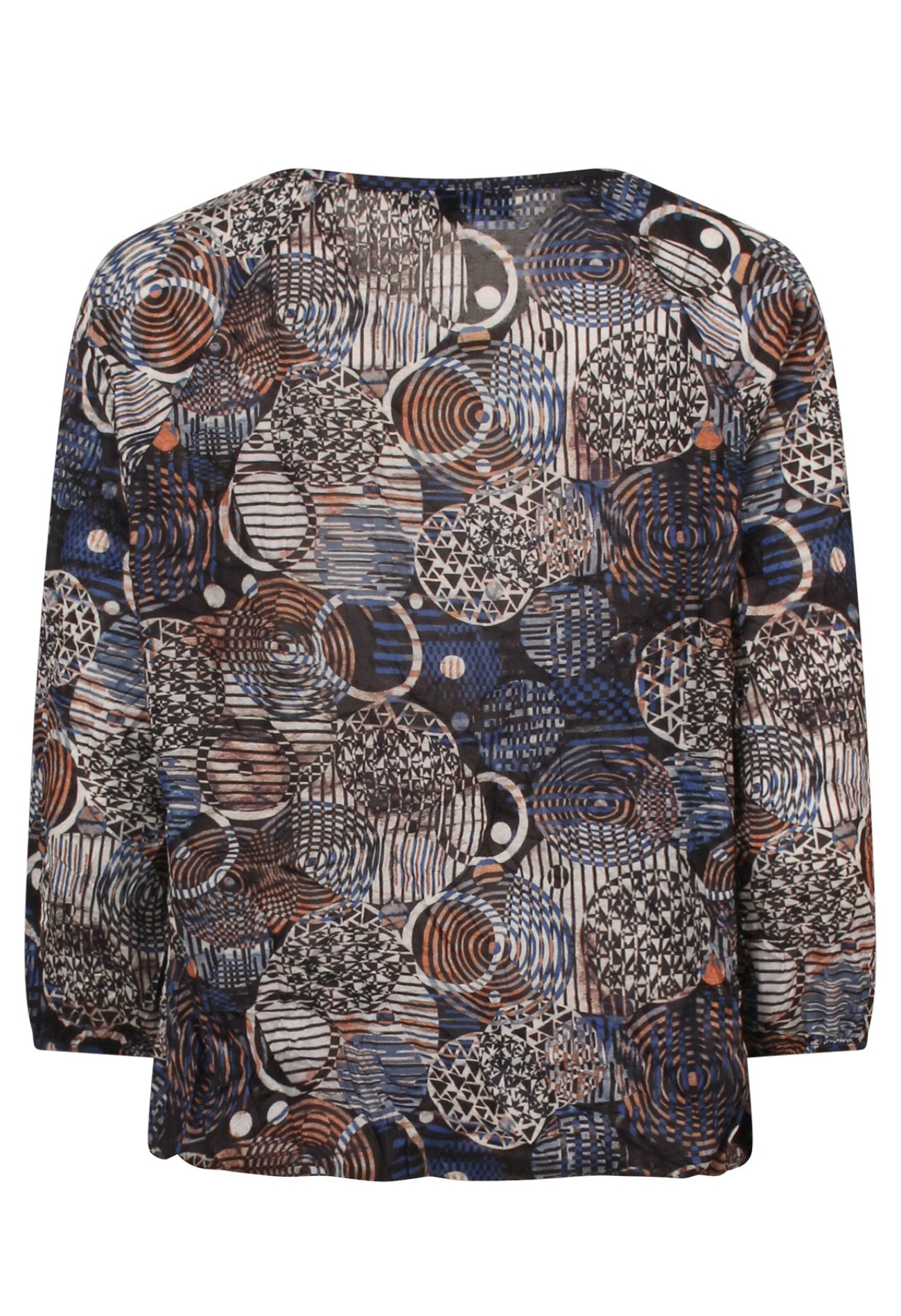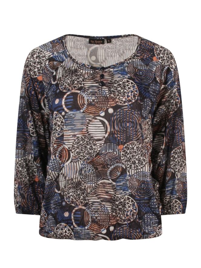 Comfortabel shirt van T-shirt stof. Met opvallend patroon van cirkels en strepen. Dit shirt heeft 3 knoopjes voor bij de hals, 3 kwart mouwen met een elastiek aan het uiteinde. Ook in de taille zit een elastiek om het shirt te kunnen laten bollen.