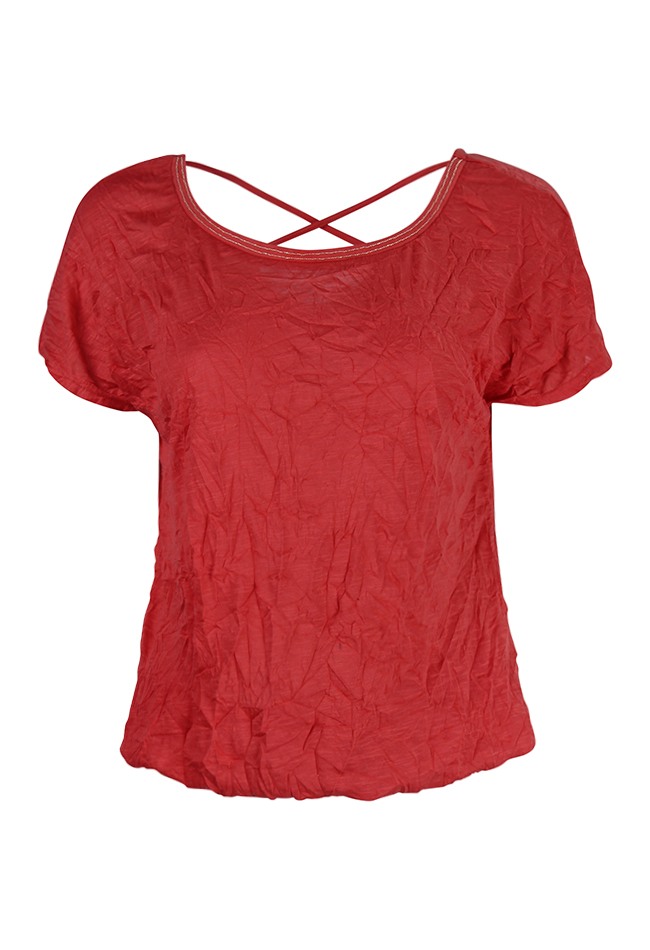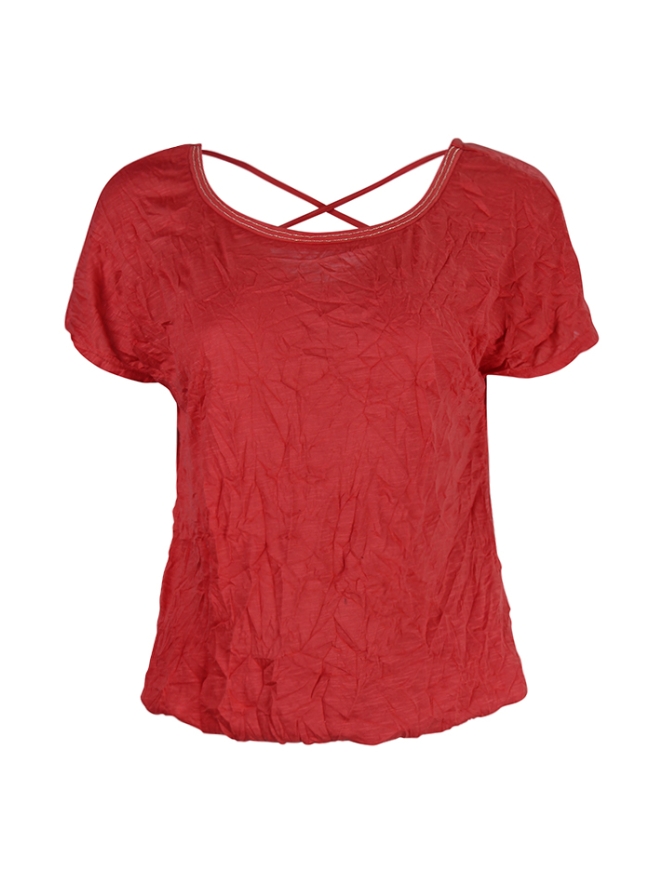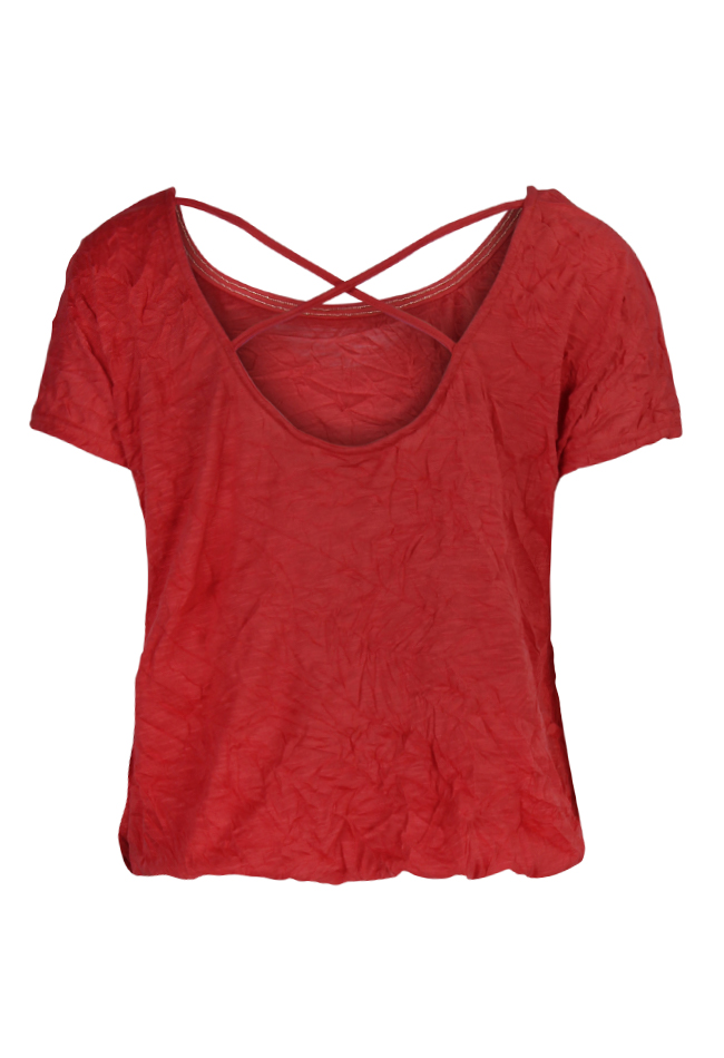 T-shirt met kreukel effect van So Soire. Het t-shirt heeft aan de achterkant een V met gekruiste bandjes. Er zit elastiek aan de onderkant. Materiaal: 100% polyester