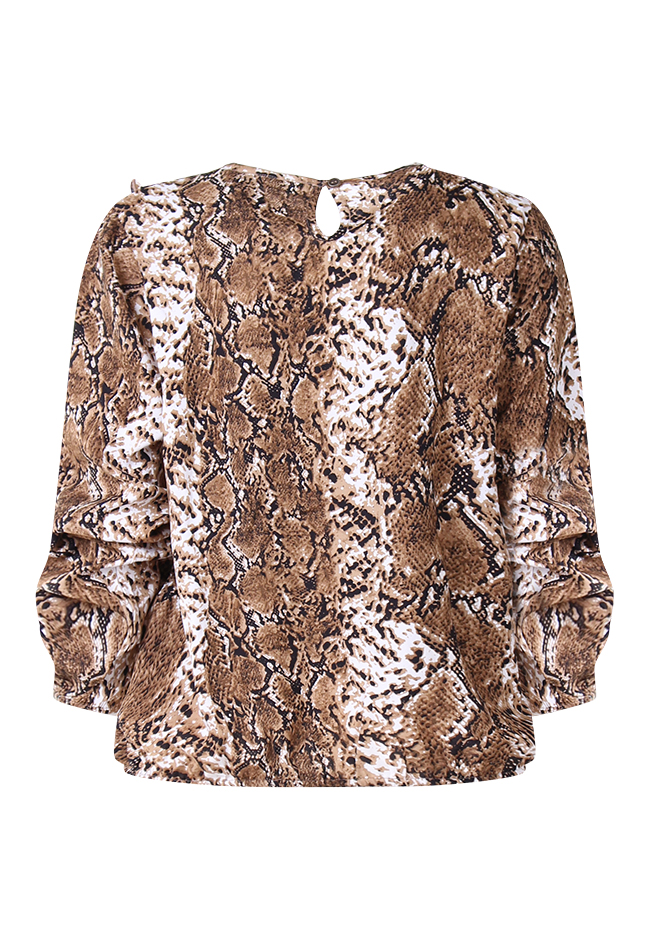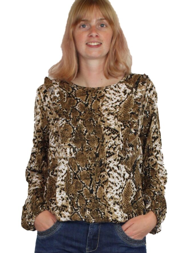 Blouse van So Soire. De blouse heeft een all over snake print en een ruche detail op de voorkant. Er zit elastiek onder in de blouse en mouwen. Valt groot. Materiaal: 100% viscose. Wassen op 30 graden, niet bleken, niet in de droger, niet strijken.