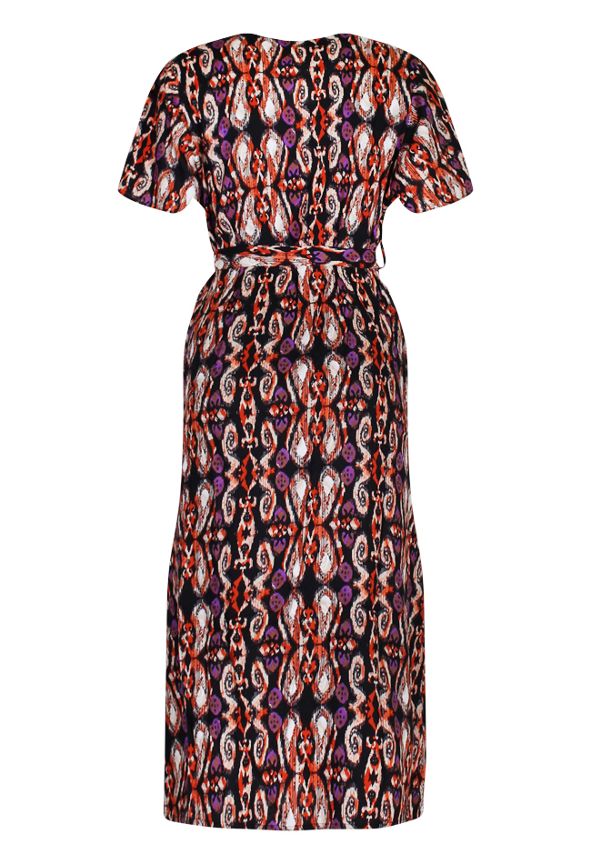 Jurk van So Soire. Deze middellange jurk heeft een V-hals en vlindermouwen. In de middel zit een strikceintuur en de jurk word gesloten door middel van knopen die van boven tot onder lopen.