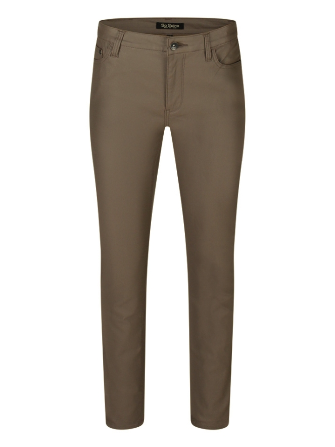 Fraaie broek met een PU coating in zwart, taupe of brons. Deze broek is een 5-pocket model en heeft een push up fit. Zit comfortabel door de superstretch formule. Combineer het met een top of trui en laat de kleuren speels terugkomen voor een extra matchende outfit.