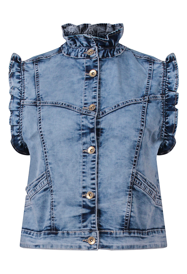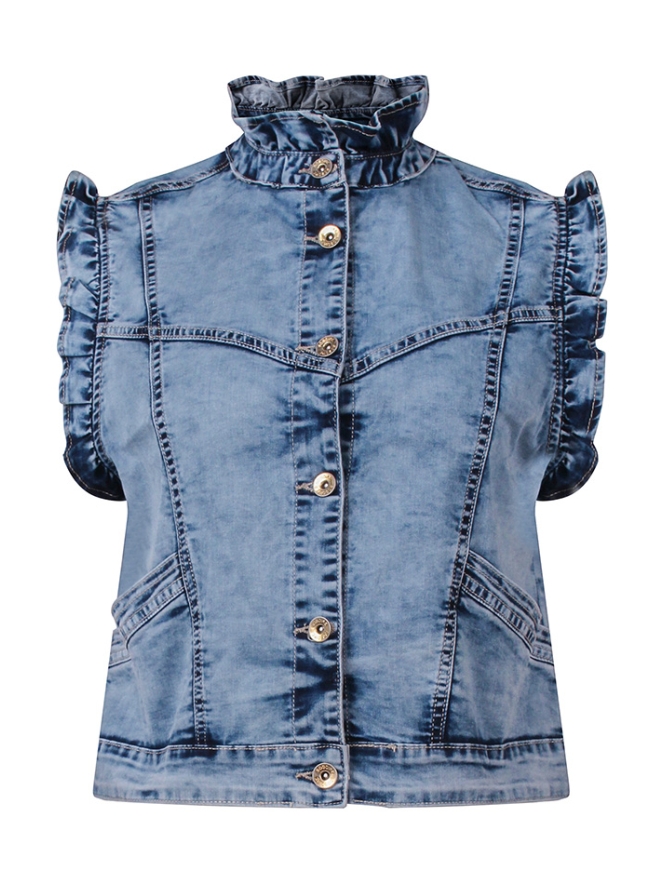 Geef je outfit een stoere en trendy touch met dit dames gilet van spijkerstof. Het model is uitgevoerd in een opvallende gebleekte wassing. Draag het casual op een jeans voor een denim-on-denim look of combineer het met een jurkje voor een verrassend contrast.