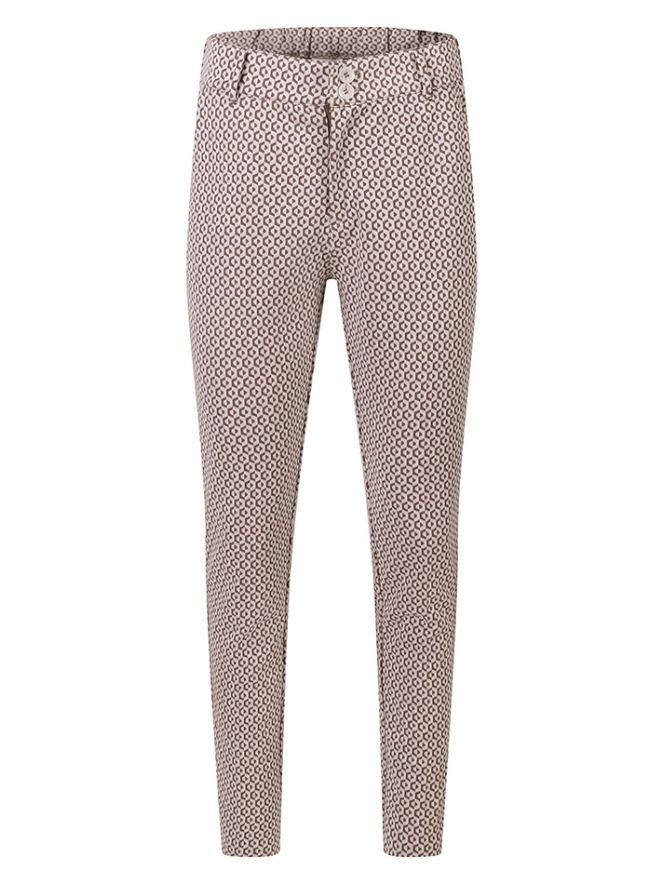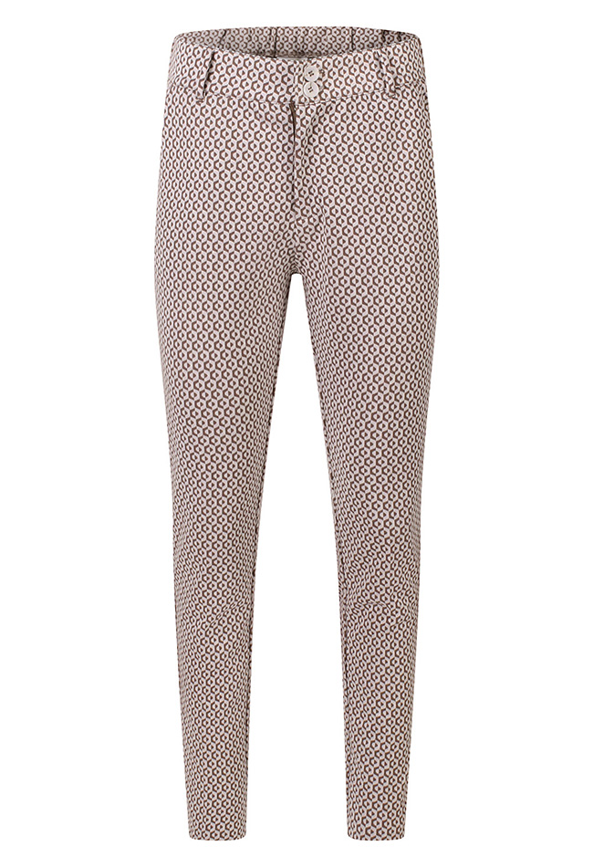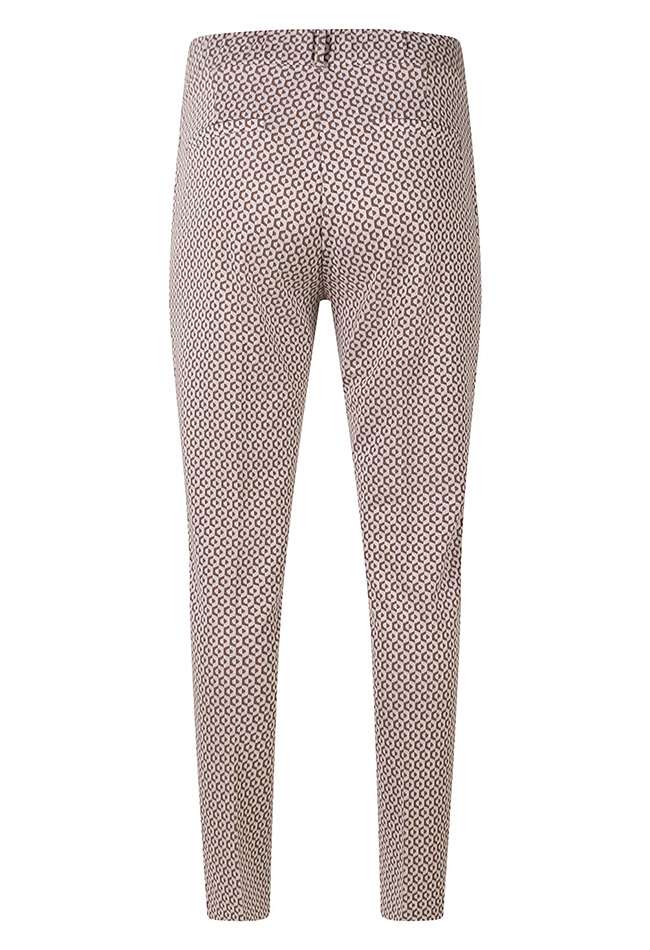 Maak een statement met deze elegante dames pantalon in een opvallende grafische print. De broek is uitgevoerd in een luxe jacquard stof, wat zorgt voor een rijke structuur en een hoogwaardige uitstraling. De toelopende pijpen geven het model een moderne en flatterende pasvorm, waardoor de pantalon zowel chic als comfortabel draagt. Perfect voor een stijlvolle werklook of een sophisticated outfit voor een avondje uit. Combineer de pantalon met de bijpassende blazer in dezelfde print voor een krachtig en trendy co-ord pak, of draag hem met een effen top voor een meer ingetogen look.