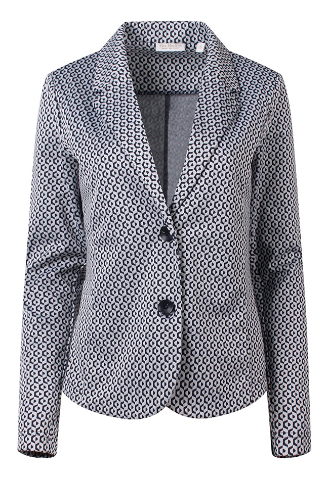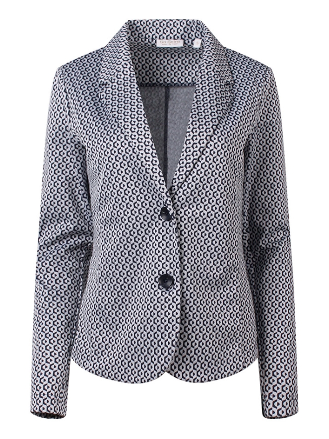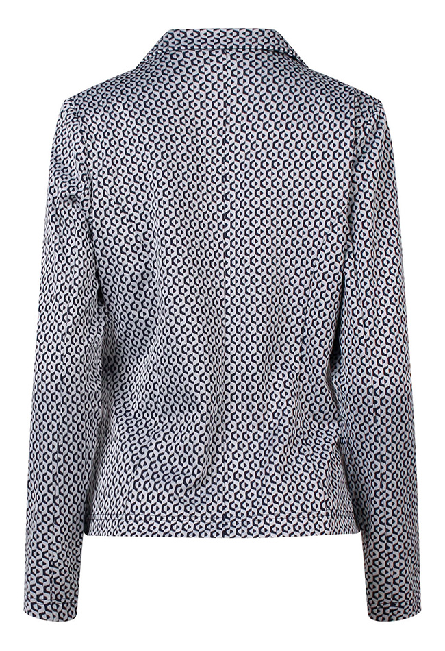 Maak een statement met deze elegante dames blazer in een opvallende grafische print. De blazer is uitgevoerd in een luxe jacquard stof, wat zorgt voor een rijke structuur en een hoogwaardige uitstraling. De reverskraag geeft dit model een moderne en flatterende pasvorm, waardoor het zowel chic als comfortabel draagt. Perfect voor een stijlvolle werklook of een sophisticated outfit voor een avondje uit. Combineer de blazer met de bijpassende pantalon in dezelfde print voor een krachtig en trendy co-ord pak.