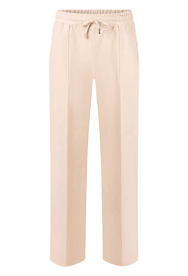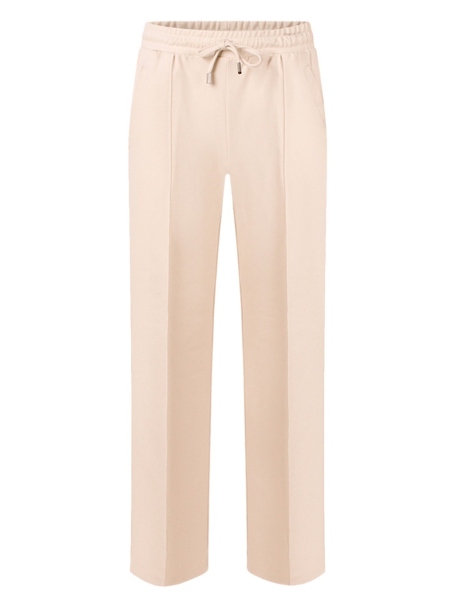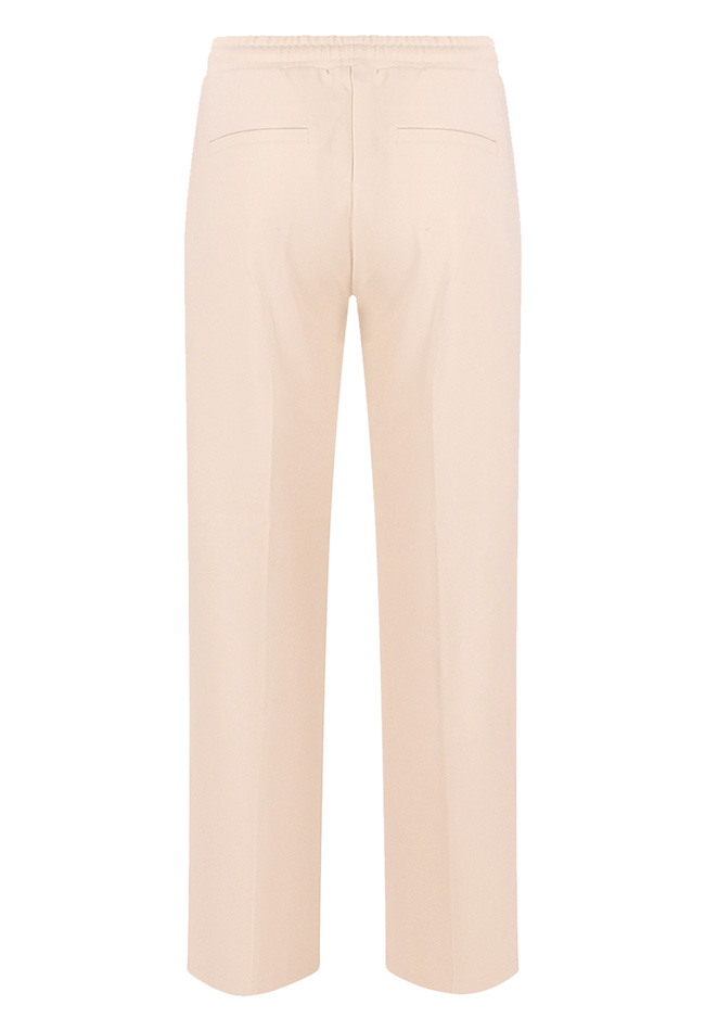 Nette pantalon met een opnaadje voor over het been. Deze broek heeft een rechte pijp, elastiek in de taille met een koordje aan de voorkant. De paspelzakken achterop zijn voor de sier maar voor zitten ritszakken.