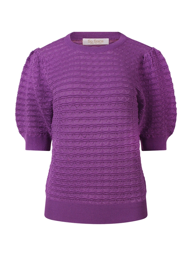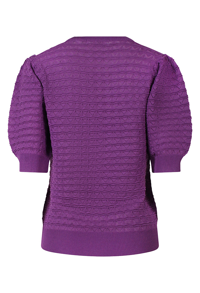Luchtige trui in 3 vrolijke kleuren. Deze mooie trui heeft een korte pofmouw en een open motief in het fijne breisel. Deze trui is goed te combineren met een mooie jeansrok maar natuurlijk ook op een mooie jeans.
