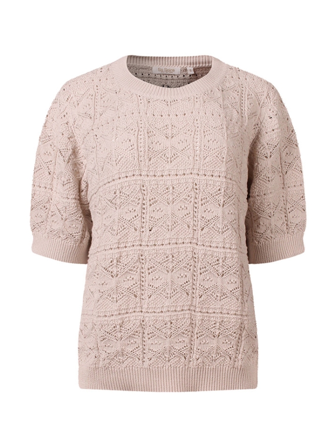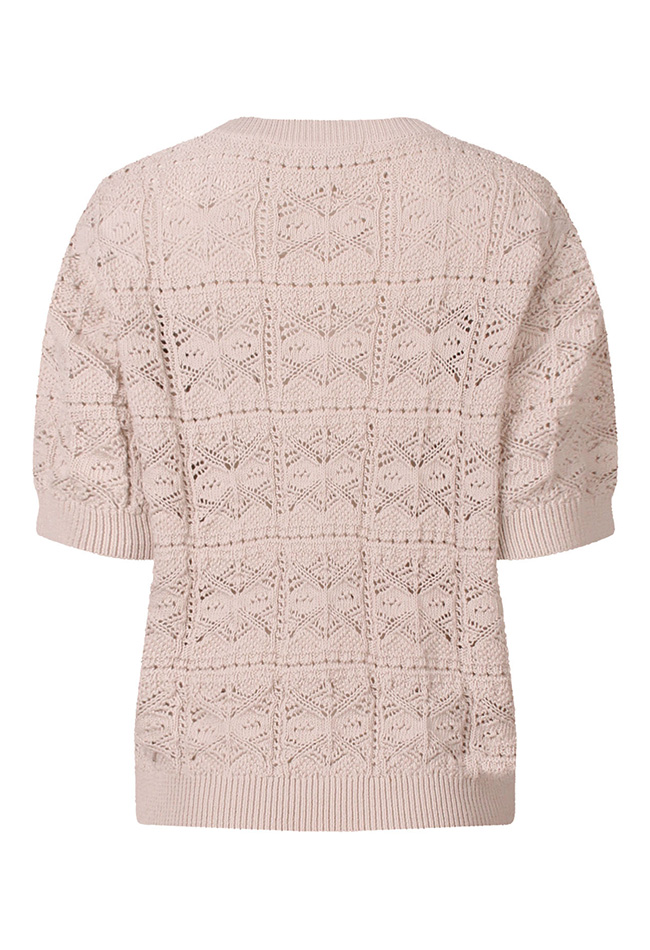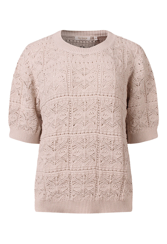 Fraaie zomerse trui met een ajourpatroon. Door het ajourmotief is de trui doorschijnend. We adviseren daarom om er een hemdje of singlet onder te dragen.