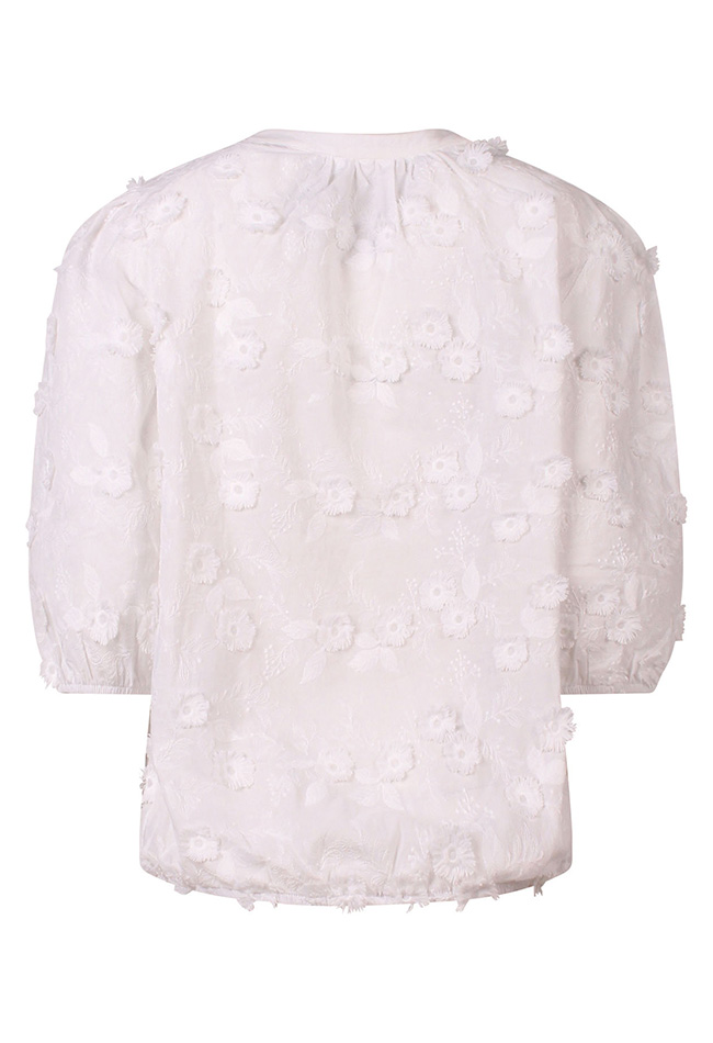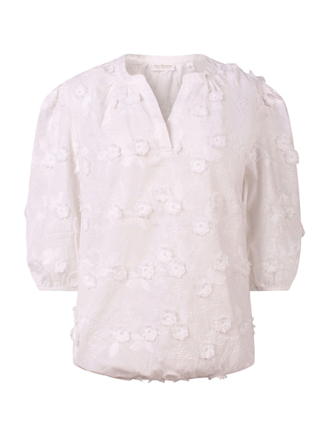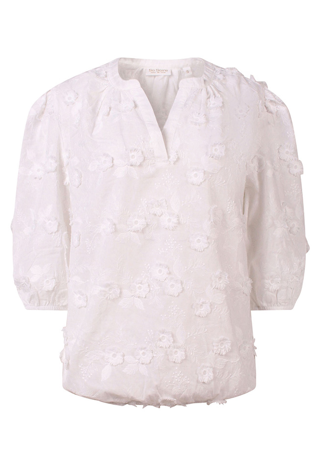 Deze prachtige top van 100% katoen heeft een allover borduring met reliefbloemen. De driekwart mouw heeft een elastiek waardoor je makkelijk zelf de lengte van de mouw kan bepalen. Sjiecke top, doet het altijd leuk op jeans maar misstaat ook zeker niet op een mooie pantalon.