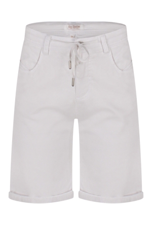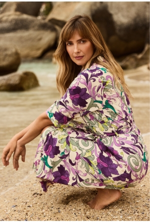 Damestop van rayon crêpe met halflange (3/4) mouwen, een kleine V-hals met koordje en kwastjes. De top heeft een opengewerkte bies langs de mouwen en elastiek bij de mouwboordjes. Uitgevoerd in een multicolor pauwenoogprint met een speels vegendessin.
