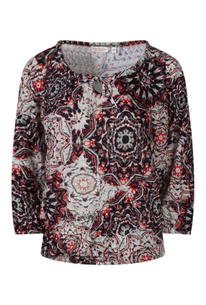 Damestop van rayon crêpe met halflange (3/4) mouwen, een kleine V-hals met koordje en kwastjes. De top heeft een opengewerkte bies langs de mouwen en elastiek bij de mouwboordjes. Uitgevoerd in een multicolor pauwenoogprint met een speels vegendessin.