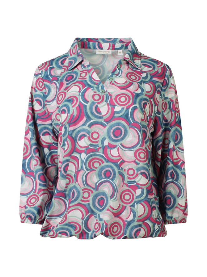 Deze stijlvolle dames top combineert comfort met een speelse uitstraling. De top is uitgevoerd met elegante 3/4 mouwen, waardoor hij perfect is voor zowel het voor- als najaar. De V-hals met subtiel polokraagje geeft het ontwerp een vrouwelijke en tegelijkertijd sportieve touch. Dankzij het elastiek in de taille valt de top mooi aangesloten en wordt het silhouet op een flatterende manier geaccentueerd.