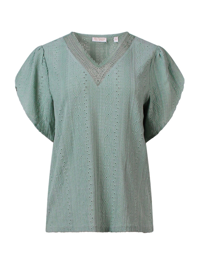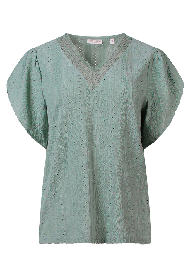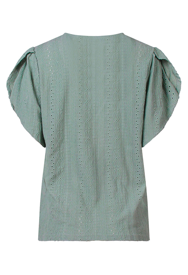 Ajour tops zijn helemaal hot. Deze top van ajour heeft een prachtige doorschijnende V hals en een mooie overslag mouw. Let op, top niet strijken.