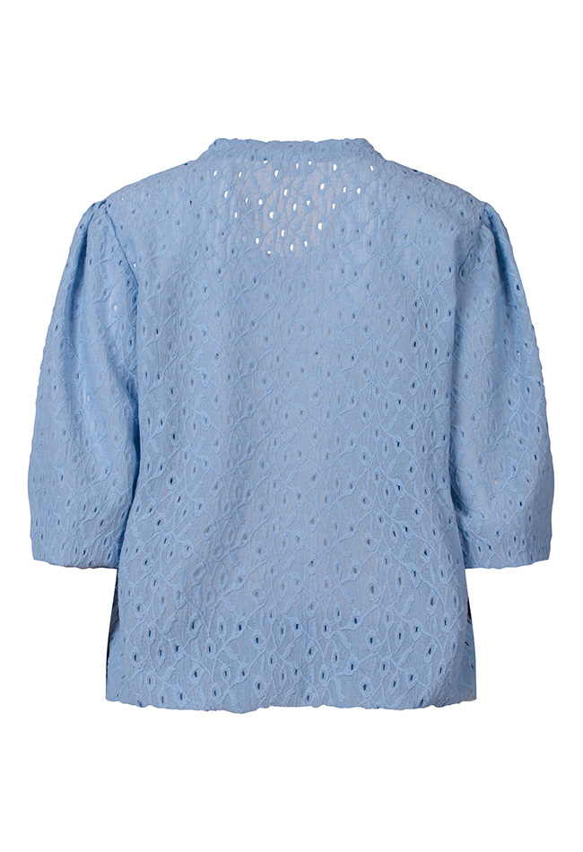 Deze elegante dames top van ajour stof geeft je outfit een luchtige en vrouwelijke uitstraling. De top heeft een flatterende V-hals die het decolleté mooi accentueert en zorgt voor een stijlvolle look. Dankzij het elastiek in de taille sluit de top mooi aan en ontstaat er een speels bloezend effect.