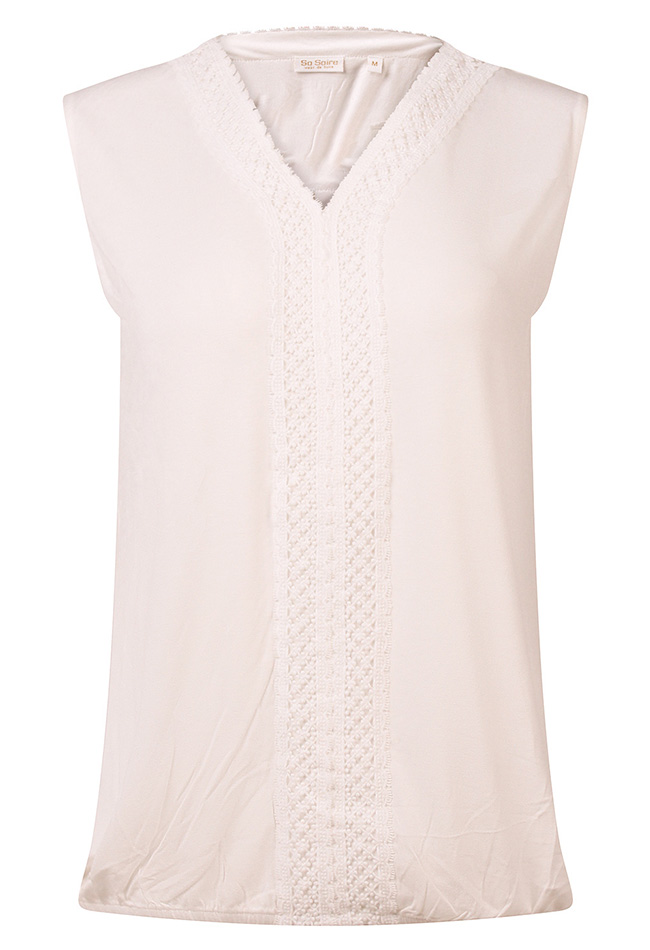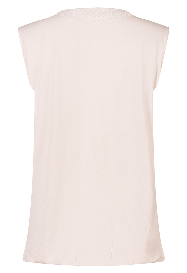 Dames top, mouwloos, met een elegante lace afwerking bij de hals en het voorpand. Voorzien van elastiek onderaan voor een comfortabele en flatterende pasvorm.