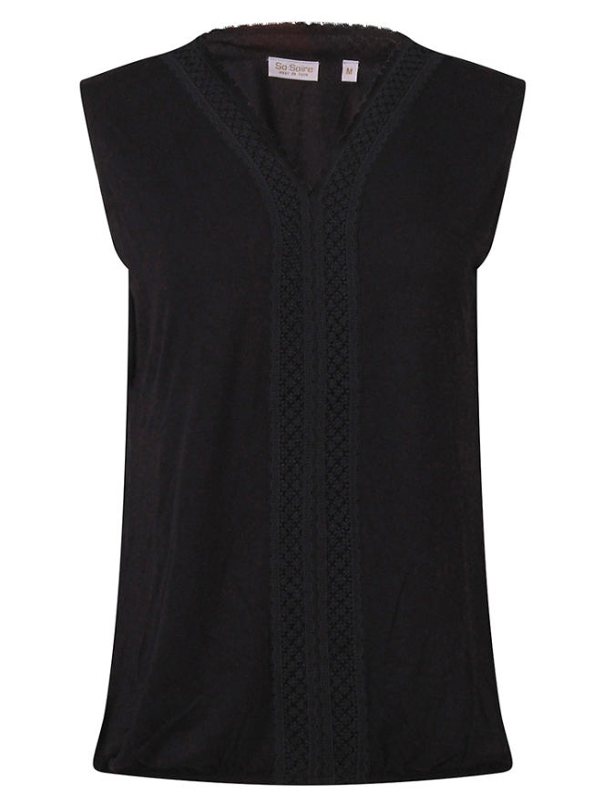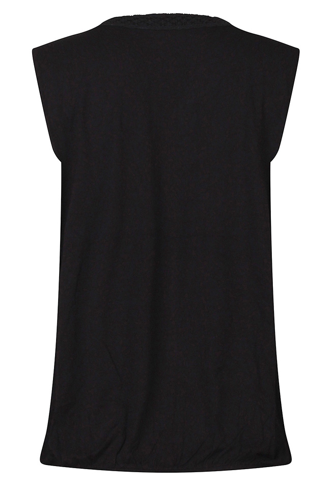 Dames top, mouwloos, met een elegante lace afwerking bij de hals en het voorpand. Voorzien van elastiek onderaan voor een comfortabele en flatterende pasvorm.