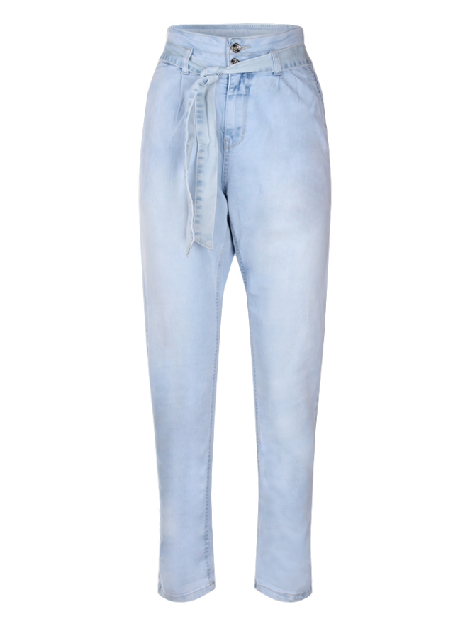 Deze jeans heeft een elastische taille met een strik ceintuur. De broek heeft een twee knoop-rits sluiting en aan de voorkant steekzakken. Onder de tailleband zit een bandplooi en op de achterkant van de broek zitten twee nep paspel zakken.