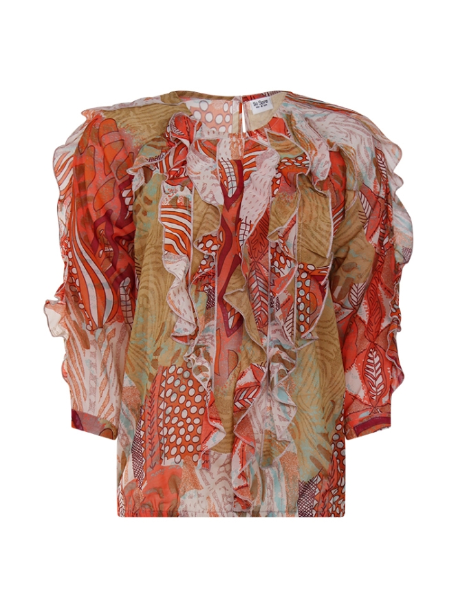 Top met 4/3 mouw en ruche aan de voorkant. In de nek zit een kleine sluitknoop. De taille heeft een elastiekenband.