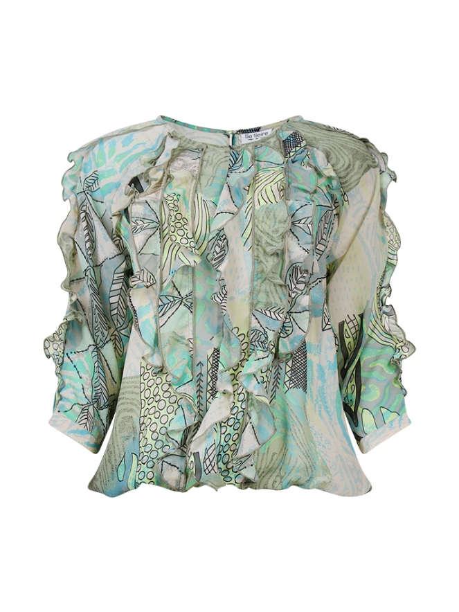 Top met 4/3 mouw en ruche aan de voorkant. In de nek zit een kleine sluitknoop. De taille heeft een elastiekenband.